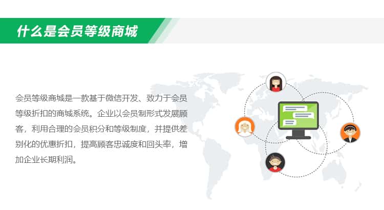 会员等级商城是一款基于微信开发、致力于会员等级折扣的商城系统。企业以会员制形式发展顾客,利用合理的会员积分和等级制度,并提供差别化的优惠折扣,提高顾客忠诚度和回头率,增加企业长期利润。